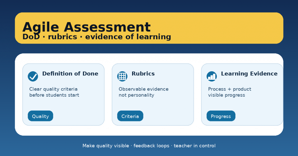 Assessment gets stressful (for students and teachers) when “quality” is unclear, feedback arrives too late, and the only evidence that matters is the final product. Agile assessment flips that: it makes expectations visible early, uses short feedback loops, and treats learning as a process you can observe and improve.