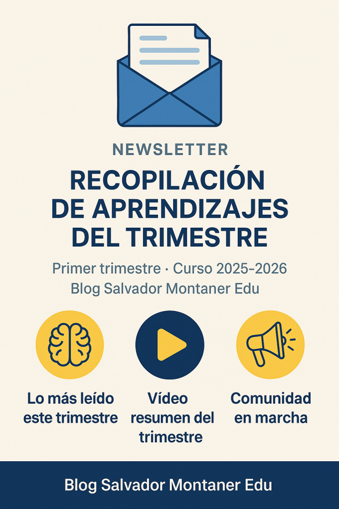 Newsletter · Recopilación de aprendizajes del trimestre Primer trimestre · Curso 2025-2026 Blog Salvador Montaner Edu Editorial: Una comunidad que crece Este primer trimestre ha sido el punto de partida de una nueva etapa para Salvador Montaner Edu. Una etapa marcada por cuatro pilares clave: liderazgo educativo, tecnologías emergentes en educación, soft skills y metodologías […]