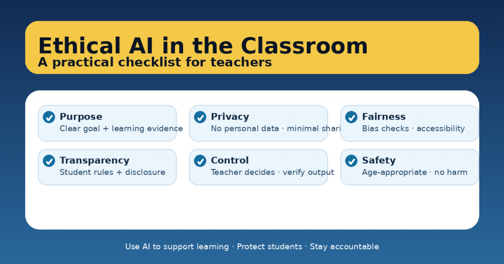 Ethical AI in education isn’t about fear or perfection. It’s about teacher control, student protection, and learning integrity—with simple routines you can apply every time.