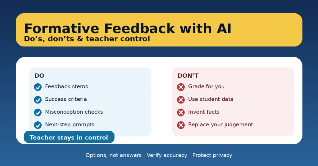 AI can make formative feedback lighter and more consistent—if it strengthens teacher judgement instead of replacing it. The safest, most effective use is when AI helps you generate tools and language, while you control criteria, evidence, and decisions.