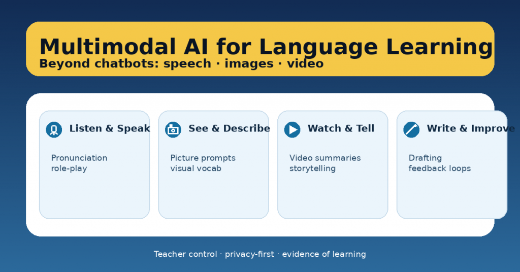 That matters because language learning is multimodal by nature. Students don’t just “chat.” They listen, speak, interpret visuals, negotiate meaning, and revise writing. Multimodal AI can support those skills—if we design tasks that keep students thinking and keep teachers in control.